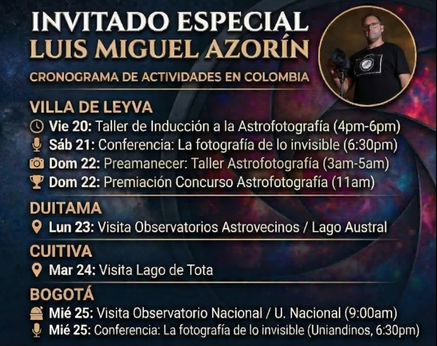 Personalmente, la visita de LUIS MIGUEL AZORIN de NATURAL PORTRAITS fue la oportunidad única que tuve de poder conocer e interactuar con uno de los personajes que seguimos hace muchos años en este maravilloso hobby de la Astronomía visual y Astrofotografía aplicada. Luis Miguel, más allá de su conocimiento y experiencia, nos trajo su simpatía y amabilidad, hecha manifiesta en la cantidad de actividades que adelantó como conferencista, panelista y amigo de las fotos del cielo desde Villa de Leyva y posteriormente en Bogotá; teniendo la oportunidad de compartir muchos eventos públicos y privados en su compañía y la de varios de los organizadores y amigos del evento.